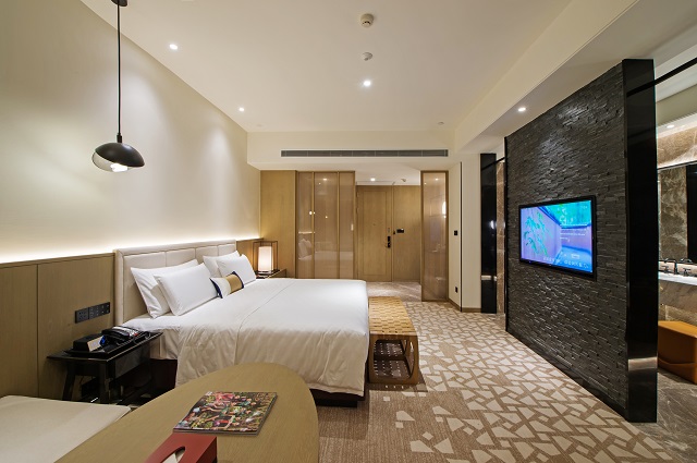 便利设施:不间断电源插座、保险箱、免费WIFI上网、电动窗帘、中央空调、国内国际长途电话、液晶电视、迷你冰箱(配饮品)。