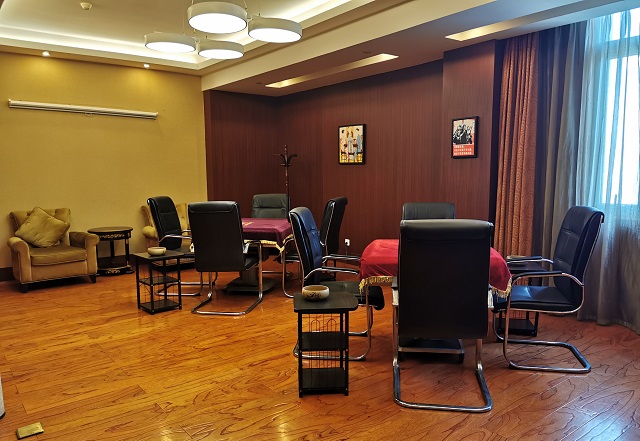 2F润兴茶厅 可乘坐3、4号电梯至2F后步行前往。 润兴茶厅是集品茗休闲、棋牌娱乐、商务洽谈为一体的娱乐会所。大厅休闲区域可容纳8桌客人品茗娱乐;棋牌包间共计9个,多种房型布置可满足不同的消费需求。 服务时间:09:30-次日02:00 预订电话:028-87737368