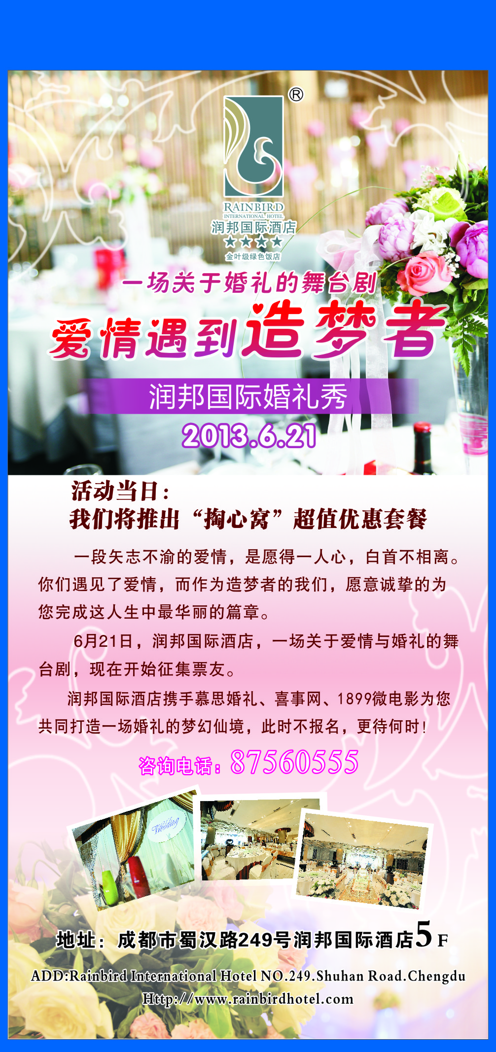 初夏已至,随着气温的变化,空气中弥漫着爱的味道。在此,润邦国际酒店策划了一场以“爱情遇见造梦者”为主题的婚礼秀活动,本活动将在2013年6月21日即将盛大举行,本次活动亮点在于摈弃了以往的古板和传统形式,采用一种新颖的舞台剧形式,让您眼前一亮,为您呈现一份不一样的感受,不一样的惊喜。在活动当日,我们还推出了“掏心窝”超值优惠套餐,期待您的加入。