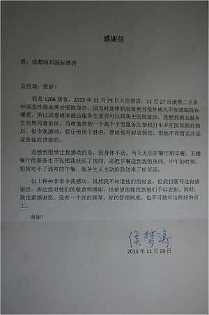 在日常经营和管理工作中,酒店涌现出了许多好人好事典型,这些员工做出了榜样,赢得了宾客的赞誉,拾金不昧、乐于助人的精神在酒店蔚然成风。 2013年12月4日,酒店总经理收到一封来自北京客人的信件,大致内容为客人在11月末入住我酒店期间,凌晨突发疾病急需就医,我酒店各部门员工积极主动并热心地为客人提供帮助并在后续康复期间提供周到地服务(具体内容见附图),客人特寄感谢信一封以表感谢。后经行政部了解,其当时主要员工为前厅销售部易春、餐饮服务部钟明涛、安全管理部廖安军。