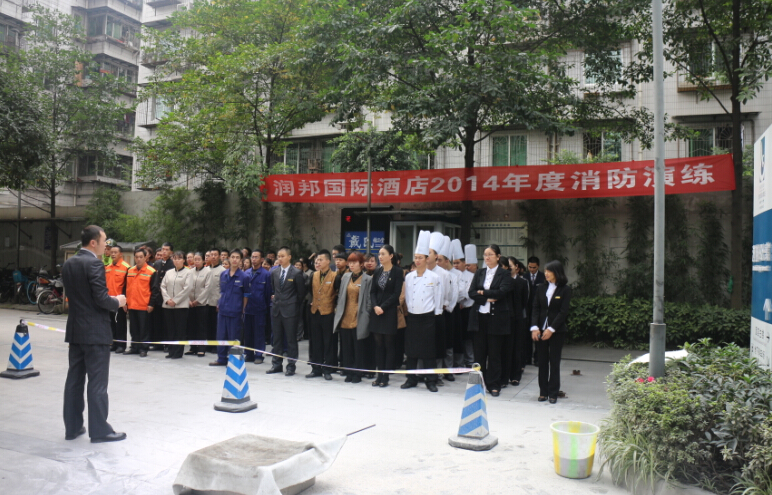 2014年11月7日下午,在润邦国际酒店安全管理部的组织下,进行了楼层配电间模拟失火及扑救油盆初起火灾的演练,此次消防演练是酒店至2008年开业以来举行的第六次大型消防演习。