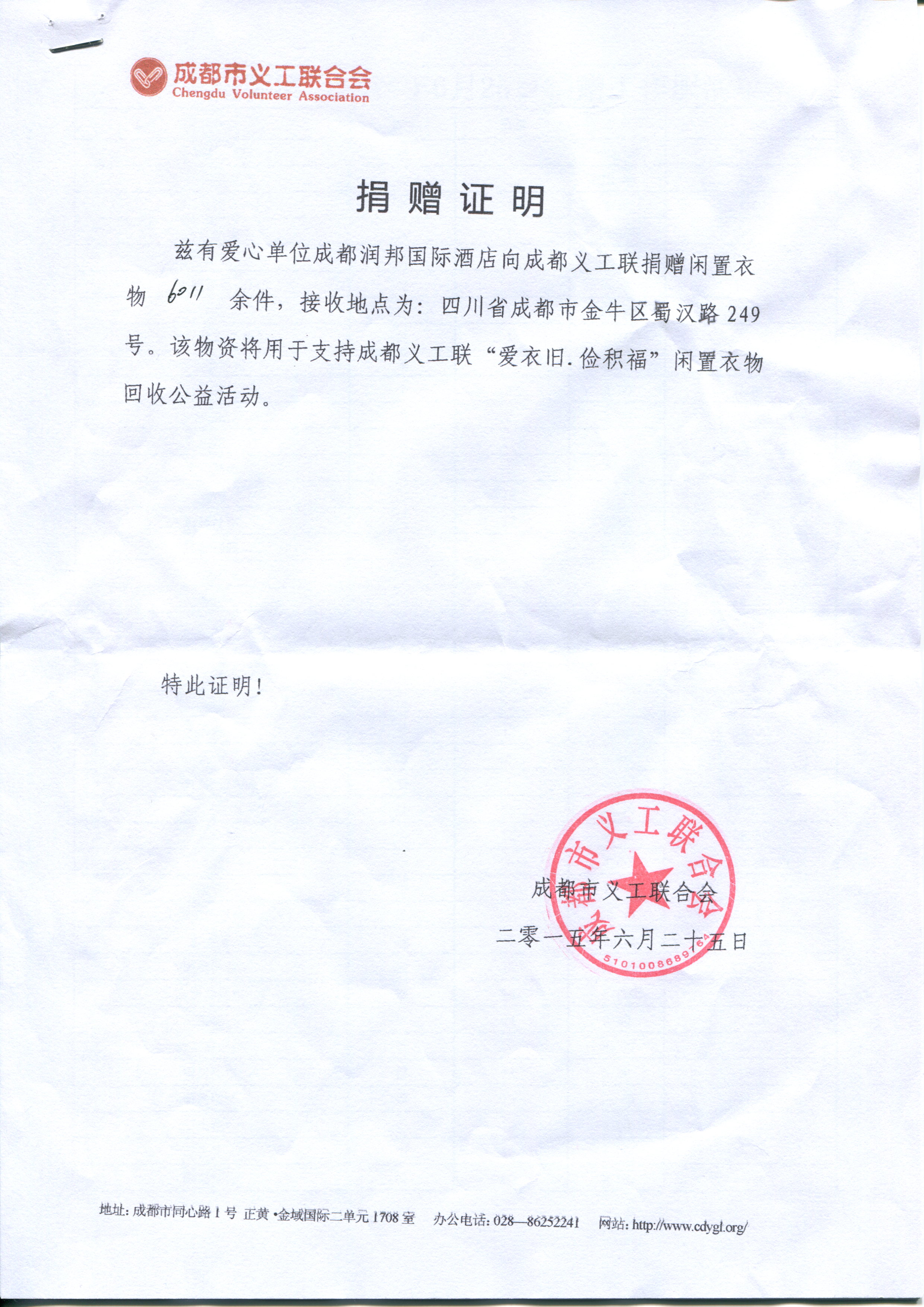2015年6月25日,润邦国际酒店为响应成都市义工联合会、成都市精神文明办主办的 “爱衣旧,俭积福”的爱心捐赠公益号召,将近几年的闲置制服进行统一整理,无偿捐赠给成都义工联,本次酒店共捐赠闲置衣物6011余件,衣服总原价值达88万余元。 本次捐赠不仅提高了旧衣物的再使用价值,也为贫困山区的家庭奉献了一份爱心。我们也会将继续将这份爱心传递下去,积极支持公益活动。