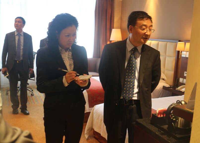 星评小组检查20F会议中心 在完成了酒店软硬件的现场考察后,星评检查小组在酒店会议中心听取了《成都润邦国际饭店四星级旅游饭店复核汇报》。汇报会上,酒店总经理黄飚先生详细汇报了酒店的基本概况、经营情况、内部管理与四星复核检查工作,并重点介绍了酒店在管理体系、企业文化、创新经营等方面的举措和探索。星评检查小组对成都润邦国际酒店为四星复核检查所做的工作给予了充分肯定,认为酒店拥有一支敬业忠诚的员工队伍、专业团结的管理团队。同时,也对酒店设施设备存在的不足给予点评。并现场宣布酒店必备项目达标、设施设备评分和营运质量评价合格,顺利通过此次四星复核检查。