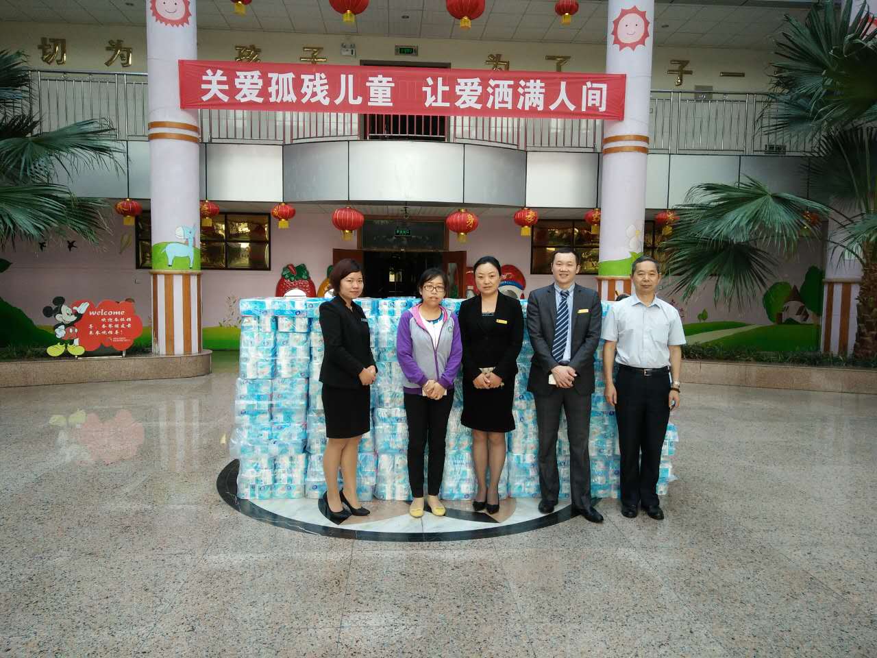 副总经理吴荻女士(中)代表全酒店员工为福利院送上爱心物资