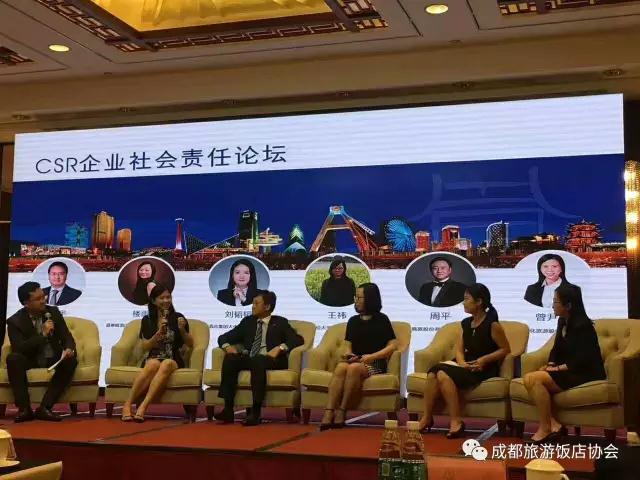 接着,成都旅游饭店协会秘书长龚宇以协会在年会上的慈善晚宴为峨边县万坪乡中心小学捐助11.6万元善款为引子,引出了成都旅游住宿业CSR企业社会责任论坛。论坛上,温德姆酒店集团大中华区人力资源部经理楼雨琼女士、洲际酒店集团大中华区公关事务经理刘韬韬女士、西南财经大学教授王祎女士、明宇商旅股份有限公司执行总裁周平先生、四川七维文化旅游股份有限公司副总经理曾尹嬿女士对酒店行业的社会责任感和酒店企业的员工认同感等内容展开了讨论。