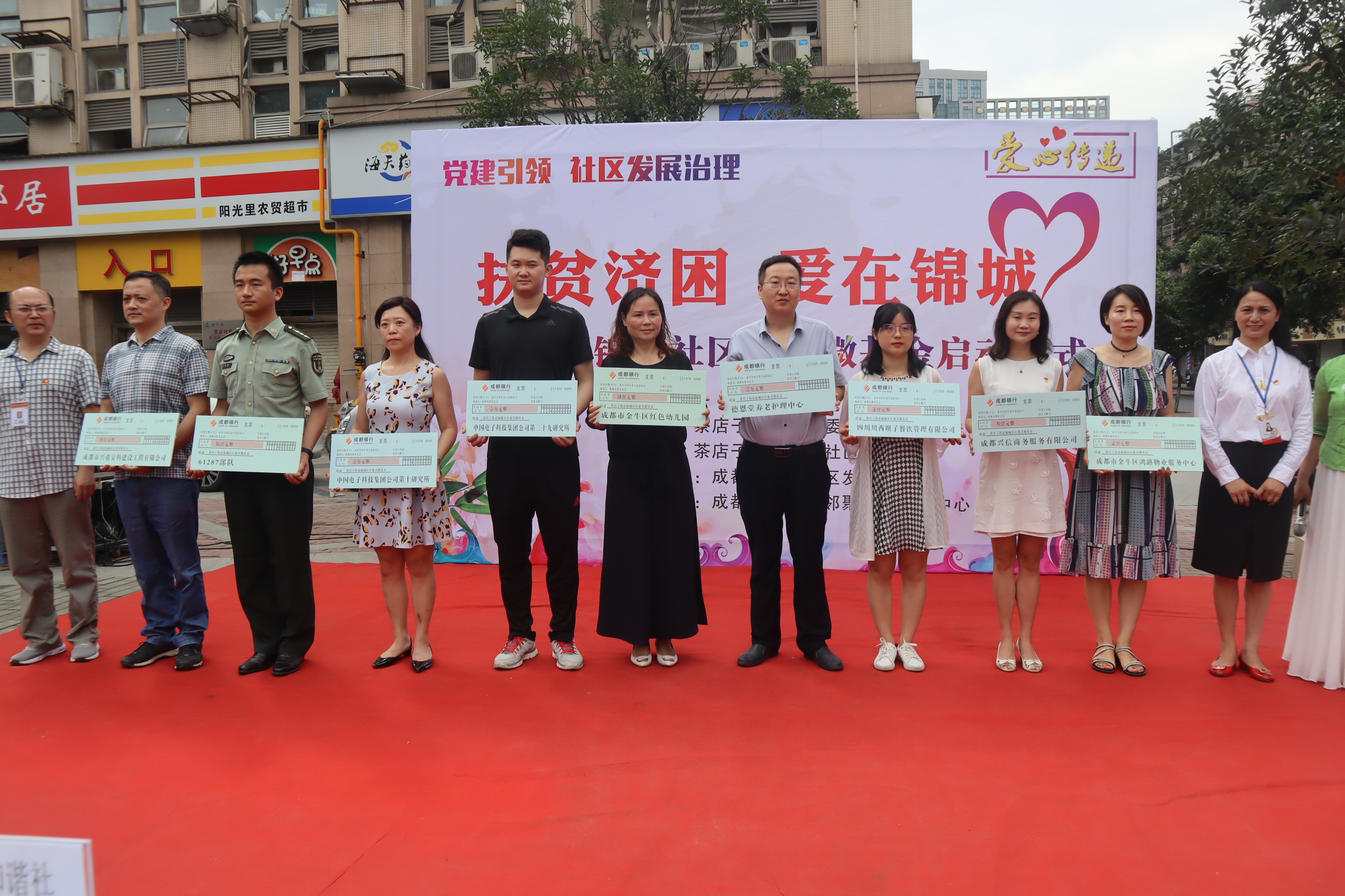 2019年7月25日上午9:30,由成都市金牛区茶店子街道党工委、办事处主办,成都市金牛区茶店子街道锦城社区承办、成都市和谐社区发展促进会指导、成都市金牛区邻聚社工服务中心协办的2019年第一届“扶贫济困.爱在锦城”文艺汇演暨社区慈善微基金启动仪式活动在在社区老邻居广场举行,锦城社区党委书记付萍,党委副书记、居委会主任徐进。党委副书记林艳曦、居委会副主任郑文建、茶店子街道副主任聂斌、派出所代表及21家爱心企业、100余名居民参与此次启动仪式。 首先,由星梦启程社会服务中心的老师带领我们用手语《感恩的心》拉开今天活动的序幕。成都市和谐社区发展促进会副部长黄子玲为锦城社区慈善微基金总干事付萍授牌正式成立成都市慈善总会社区专项慈善基金锦城社区慈善微基金。 茶店子街道副主任聂斌致辞,代表锦城社区的全体人员对参与的领导及嘉宾和工作人员致以最真挚的感谢,并宣布启动仪式开始。同时锦城社区主任徐进为大家宣读“锦城社区慈善微基金”招募倡议书,表明建立“社区慈善微基金”的目的是在社区传递爱心,弘扬慈善文化,挖掘社区在地资源,培养社区自组织,支持社区公益项目开展,提升社区居民参与,促进社区公共服务的发展和社区共融共建共享。“社区微基金”的建立将会为社区发展、改善社区公共设施、志愿服务等方面起到重要的推动作用,同时也是政府政策性救助的有效补充。