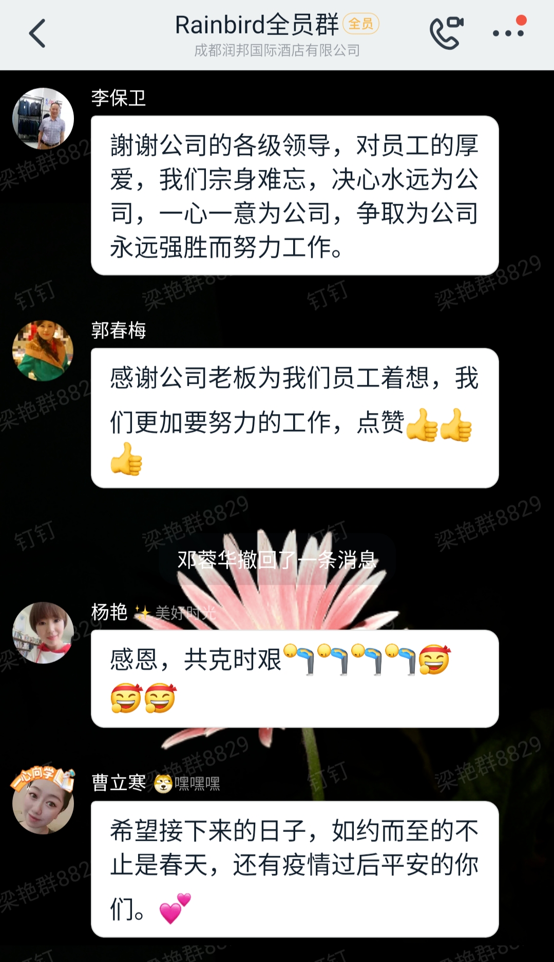 受新冠肺炎疫情影响,酒店在2020年2-3月期间,曾7次分时段调整经营情况,仍有70%员工待岗在家。 据了解,疫情期间很多企业选择了停发工资、只发生活费、减薪、裁员等方式。然而,润邦国际酒店却在这个时期承担起了应有的责任,坚持不裁员、不减薪,所有待岗员工仍有70%工资。消息一出员工群内便发来了各级员工的热烈呼应,纷纷对公司的好政策予以感激、点赞、回复:若有战、如必回,与公司共进退。